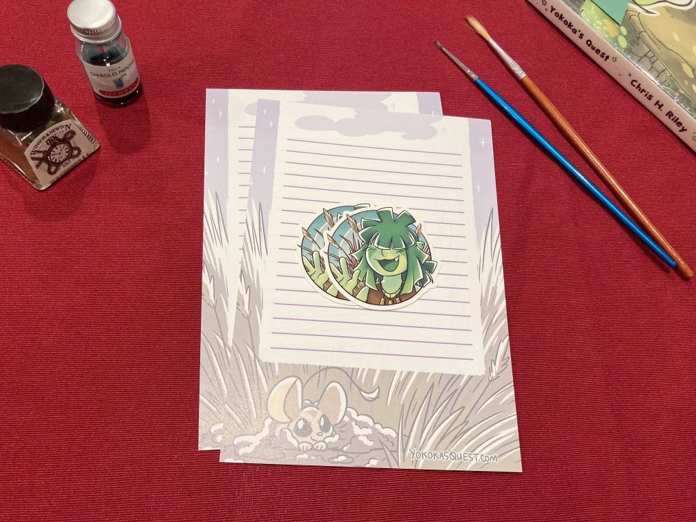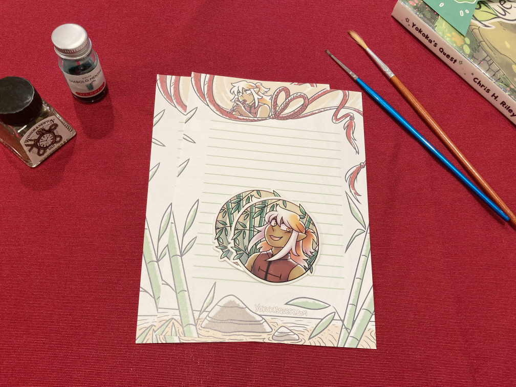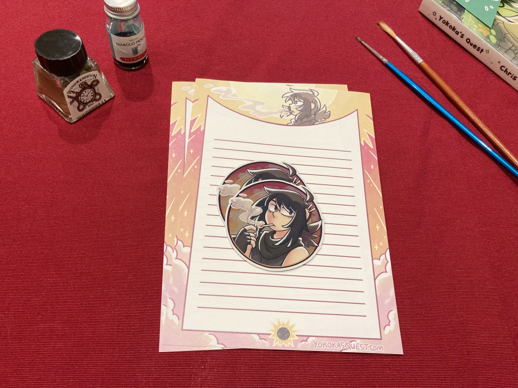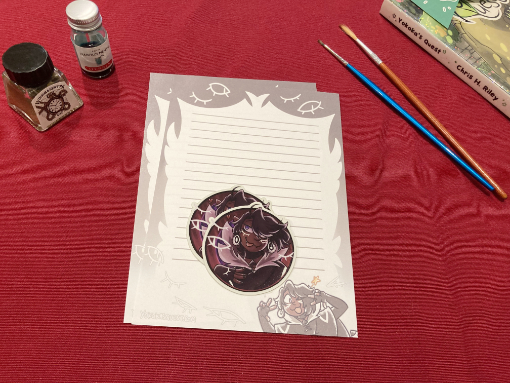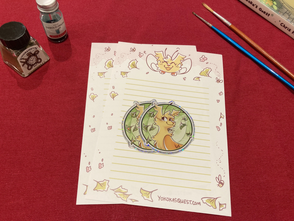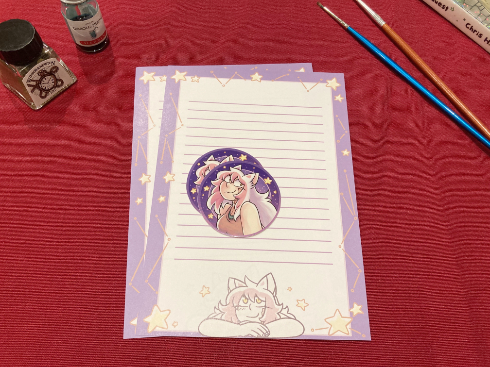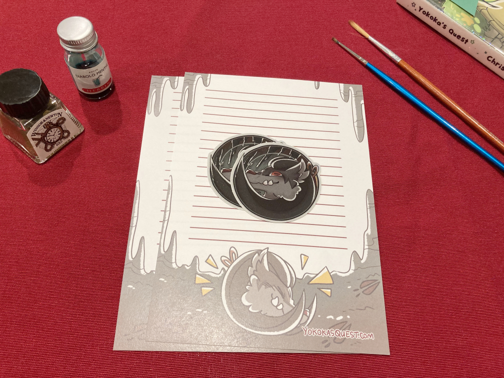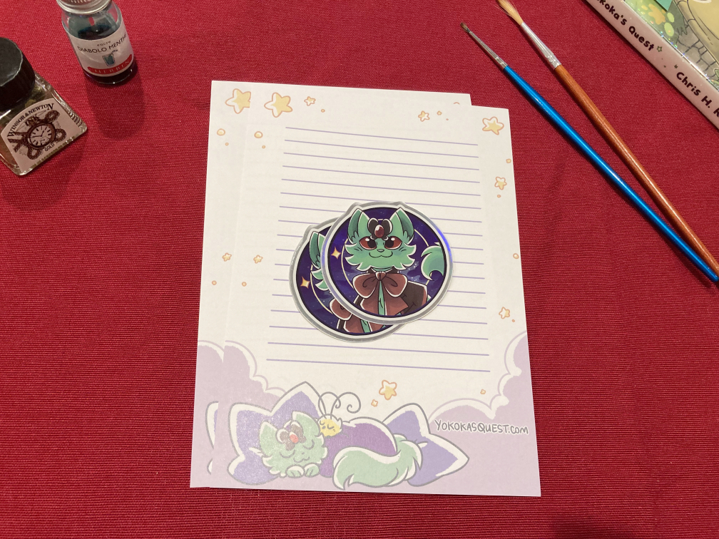 These are stickers and stationery first offered in Patreon/Ko-fi's mail club tier, without the other extras. Each set includes two vinyl stickers (effect is listed in the drop down), two pages of stationery and free shipping.